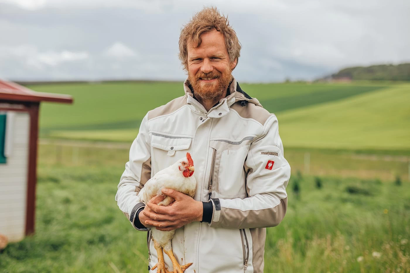 Seit Oktober 2016 hält die Familie Jenner Hühner und Hähne im Stall und auf der Weide – die sogenannten 'Wanderhühner'. Das sind Weidehühner, die ein ganz besonders artgerechtes Leben im fahrenden Stall führen. Der Hühnerstall ist nämlich als Mobilstall konzipiert, der auf einer Wiese steht und so nach Bedarf immer wieder auf ein neues, frisches Stück Weide gefahren werden kann. So gibt es für die Hühner immer das frischeste Gras und die leckersten Kräuter mit wertvollen Nährstoffen zum Picken und Entdecken. So viel Freiheit und die Auswahl der besten, gesunden Böden zeigt sich in der Qualität des Geflügels. Die gras- und kräuterreiche Ernährung – ergänzt mit der eigenen, selbst angebauten Getreide-Rezeptur – für das wandernde Federvieh ergibt ein besonders zartes, aromatisches Fleisch, das frei ist von jeglichen Hormonen oder Antibiotika!
